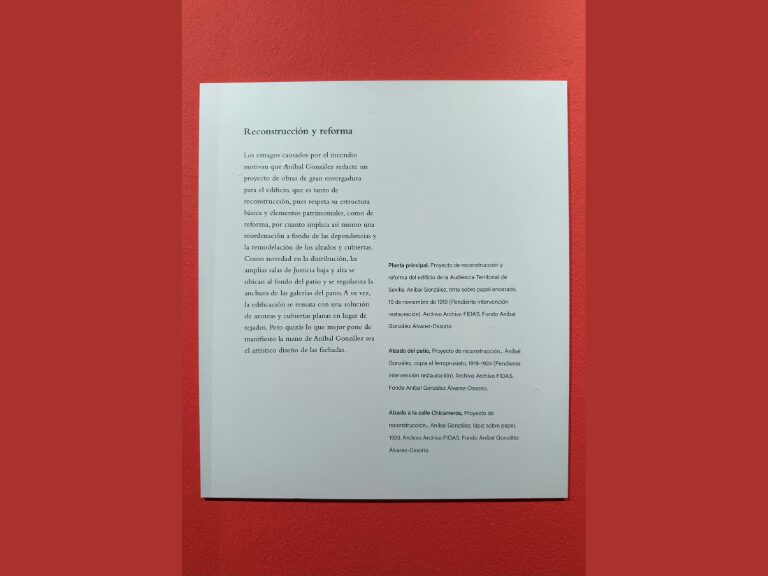 FIDAS ha contribuido en la puesta en marcha de esta exposición con la cesión de diversos originales que los visitantes podrán contemplar correspondientes al fondo documental existente en el Archivo de nuestra Fundación de Aníbal González Álvarez-Ossorio relativos al proyecto de restauración y reforma de la Antigua Real Audiencia de Sevilla, acometida por el arquitecto sevillano entre 1918 y 1924.