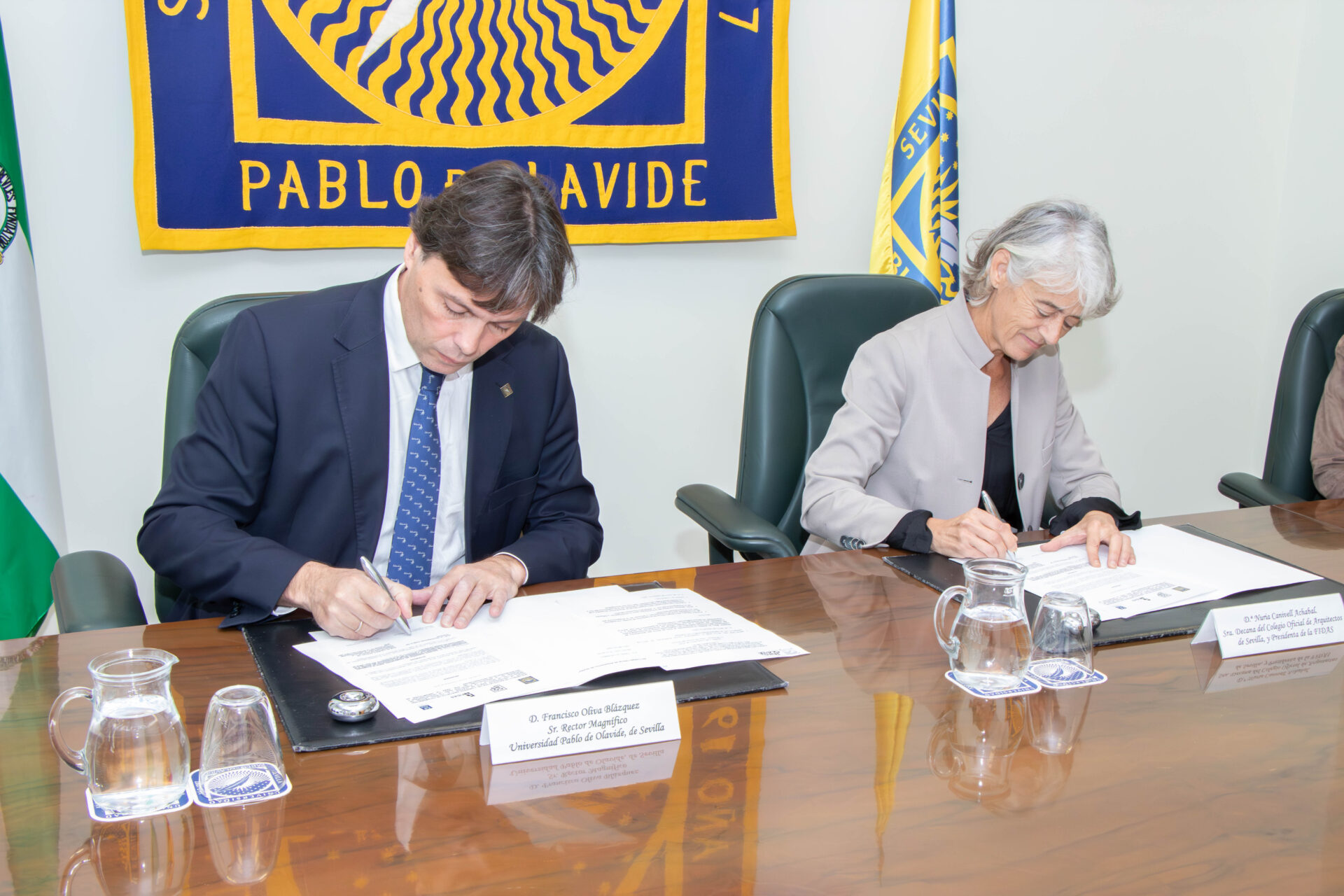El acto de firma, a cargo del rector de la Universidad Pablo de Olavide, Francisco Oliva Blázquez, y de la decana del Colegio Oficial de Arquitectos de Sevilla y presidenta de FIDAS, Nuria Canivell Achabal, ha contado también con la presencia de la vicerrectora de Relaciones Institucionales, Formación Permanente y Fundaciones, Laura López de la Cruz; del director-gerente de la Fundación FIDAS, Alejandro Durendes Muñoz; del director de la Escuela Politécnica Superior de la UPO, Luis Merino Cabañas y de la directora de Comunicación y Estrategia de la Fundación Universidad Pablo de Olavide, Lola Ortiz Herrera.