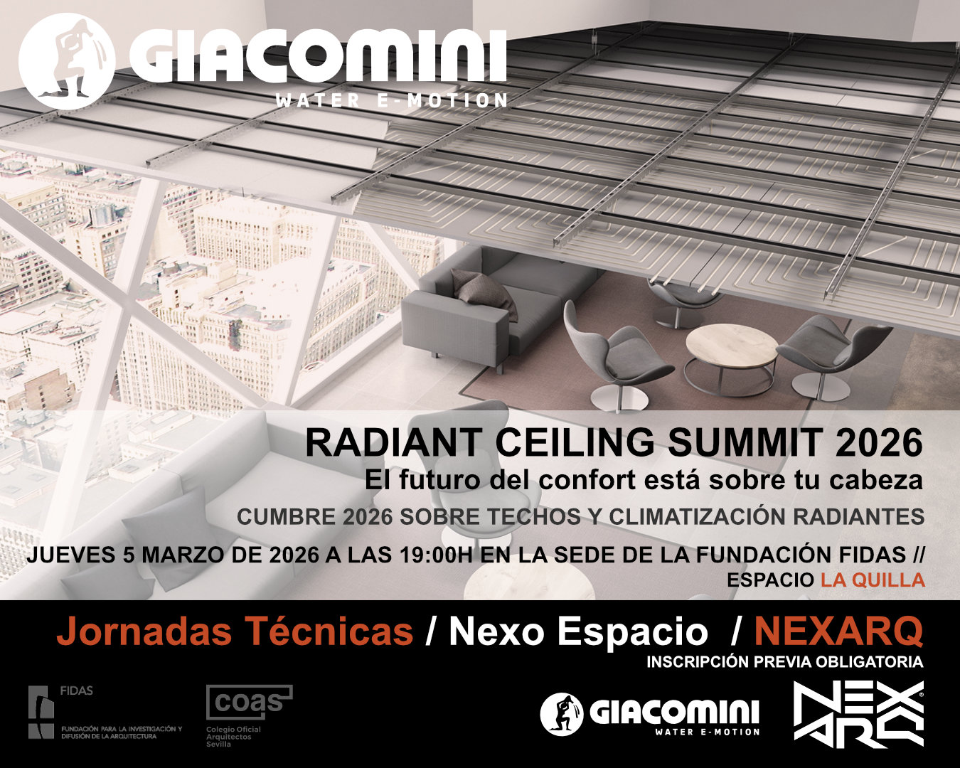 En el marco del Proyecto NEXARQ  y junto con la empresa GIACOMINI, se ha organizado una jornada técnica presencial sobre techos radiantes “RADIANT CEILING SUMMIT 2026” (El futuro del confort está sobre tu cabeza)  para el jueves 5 de marzo 2026 de 19:00h. a 21:00h. en el Salón de Actos de FIDAS.