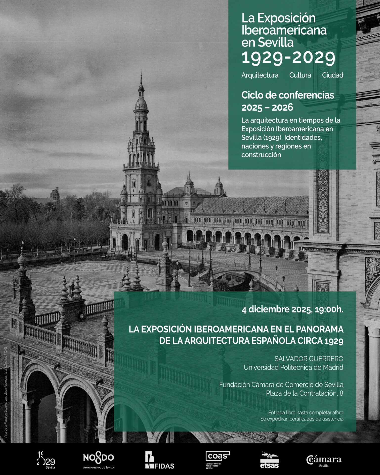 El próximo jueves 4 de diciembre, a las 19:00 horas, la Fundación Cámara de Comercio de Sevilla (Plaza de la Contratación, 8) acogerá la celebración de la segunda conferencia del Ciclo ‘La Exposición Iberoamericana en Sevilla (1929-2029). Arquitectura, Cultura y Ciudad’, organizado por la Fundación para la Investigación y Difusión de la Arquitectura del Sur (FIDAS), el Colegio Oficial de Arquitectos de Sevilla (COAS) y la Escuela Técnica Superior de Arquitectura de la Universidad de Sevilla y que cuenta con la participación del Excmo. Ayuntamiento de Sevilla y la Cámara de Comercio de Sevilla.