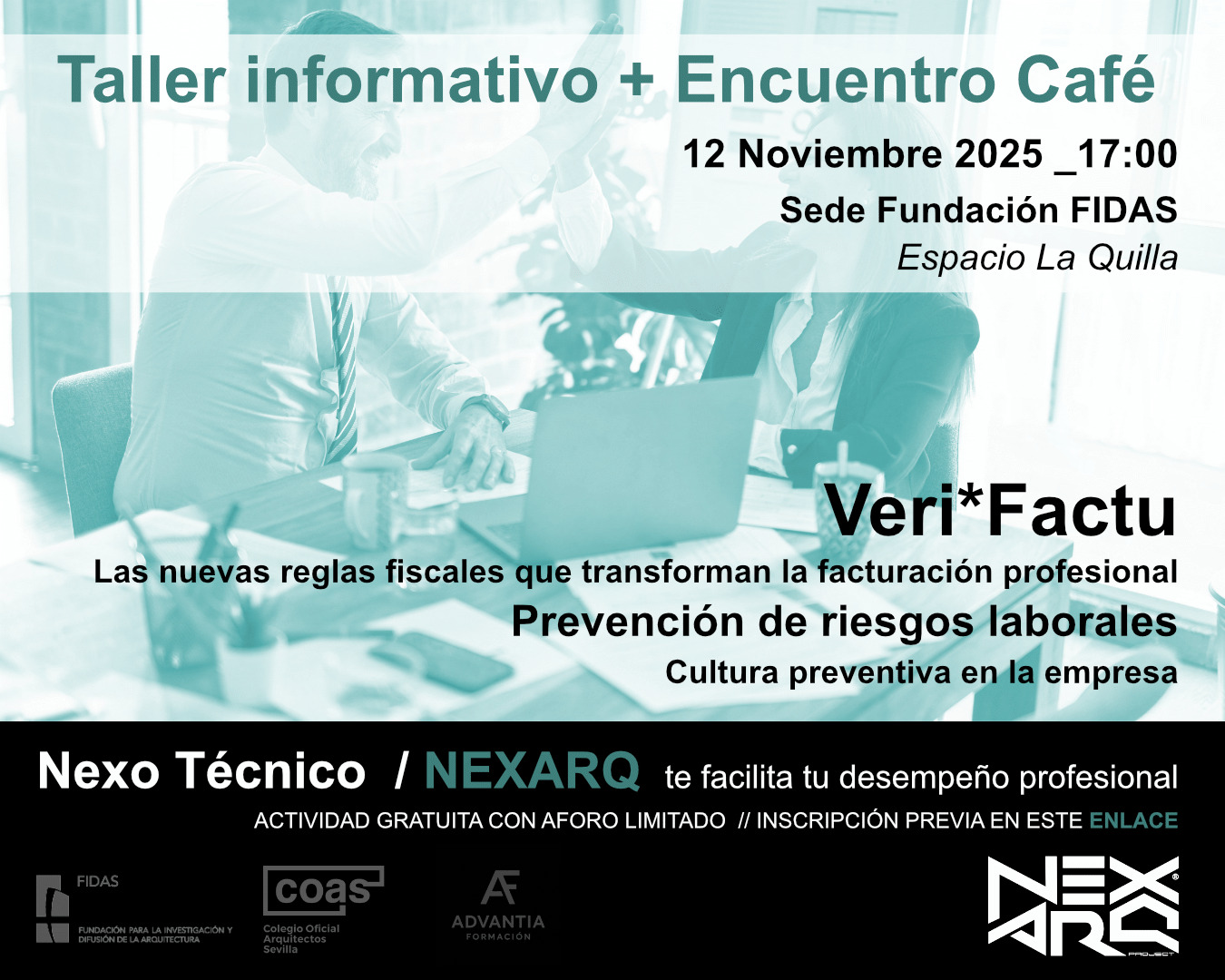 En el marco de NEXARQ, el próximo miércoles 12 de noviembre, a las 17:00 horas, en la Sala La Quilla de la Fundación FIDAS (Avda. Marie Curie, 3. Isla de la Cartuja. Sevilla), celebraremos el Taller Informativo Veri*factu, en el que abordaremos dos temas de especial relevancia en la gestión empresarial actual: el sistema Veri*factu, destinado a gestionar la transparencia y la trazabilidad en los procesos de facturación; y la Prevención de Riesgos Laborales, pilar fundamental para promover entornos de trabajo seguros y saludables.